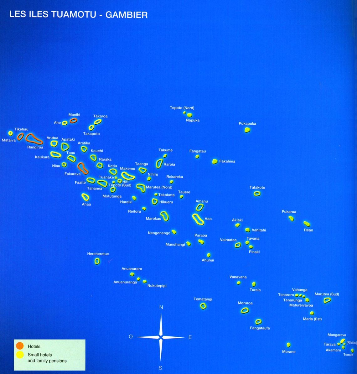 Архипелаг Туамоту состоит из двух гряд низменных атоллов, в административном отношении подразделение Туамоту-Гамбье делится на 17 коммун и насчитывает около 78 атоллов, наиболее популярны среди туристов Манихи, Рангироа и Тикехау.