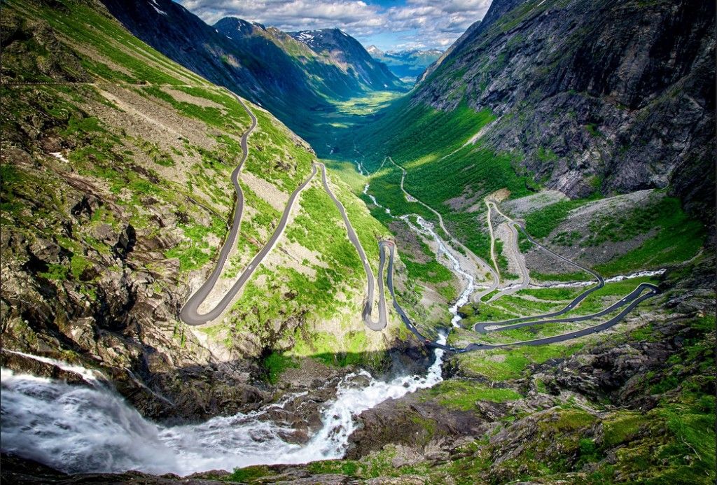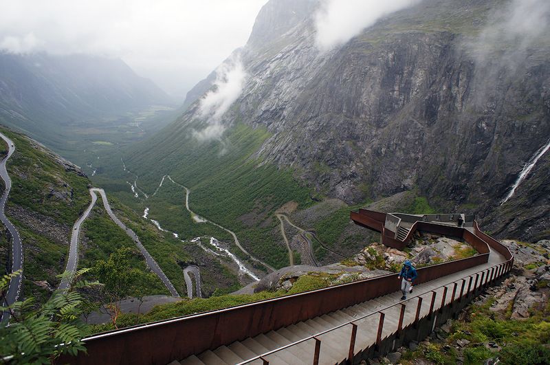 Дорога троллей, или Лестница троллей (Trollstigen), расположена в 15 км южнее городка Ондалснес (Åndalsnes) в провинции Мёре-о-Румсдал (Møre og Romsdal). Строительство дороги началось в нач. XX в. Дорогу открыли 31 июля 1936 г. На открытии присутствовал король Норвегии Хокон VII, который и дал название новой дороге – Лестница троллей. Эта популярная туристическая дорога, соединяющая долины Валльдал (Valldal) и Румсдал (Romsdal), поднимается на высоту 858 м над ур. м. и считается примером инженерного искусства. Захватывающий дух серпантин с 11 крутыми поворотами протянулся на 6 км. Дорога троллей в окружении высоких гор и низвергающихся с огромной высоты водопадов выглядит чарующе. Величие природы подчеркивают и названия здешних горных пик: Король (Kongen), Королева (Dronningen), Епископ (Bispen). Поднявшись к высшей точке дороги и выйдя на смотровую площадку, вы сможете полюбоваться прекрасным видом на долину Валльдал, водопад Стигфоссен (Stigfossen), город Ондалснес и Стену троллей.