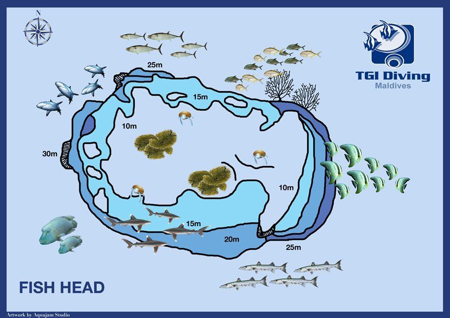 Риф Мушимасмингили, также известный как Fish Head, находится под защитой правительства Мальдив. Якоря, рыбалка, сбор раковин и кораллов запрещены. Это самое известное место для дайвинга в нашем районе и одно из самых известных на Мальдивах. Это коралловый холм (Тила), лежащий на песчаном дне на высоте 40 метров, а вершина этого холма находится на высоте от 8 до 12 метров. Он находится внутри атолла, но перед важным каналом атолла, поэтому иногда в Рыбной Голове может быть очень сильное течение. Из-за сильного течения и расположения, погружение впечатляет. По бокам есть множество пещер, в которых прячется множество морских обитателей. Течение радует стайку серых рифовых акул, все самки, а также невероятное количество фузилеров и других стай охотничьих рыб, таких как большой окунь, тунец и джек. Иногда на глубине 12 метров бывает темно, и поверхность под настоящей стеклянной крышей сложно увидеть. Сеансы охоты - это место, где Джек, Гигантские Тревелли и другие хищники бросаются ловить стеклянную рыбу, а фузилеры впечатляют.