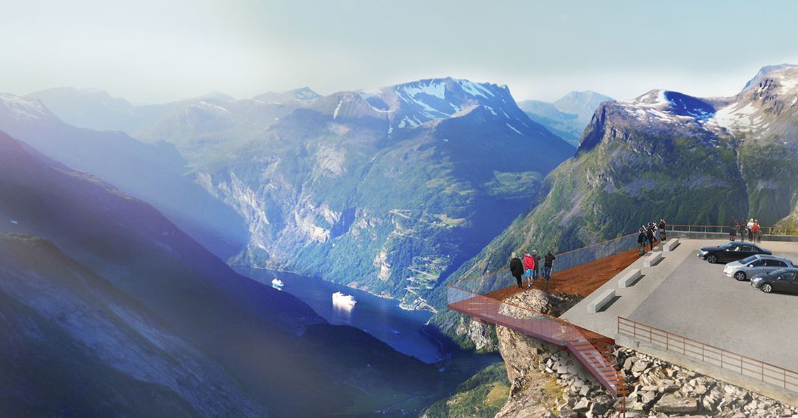 Самый восхитительный вид на фьорд открывается с словно парящей в воздухе скалы Флюдалсьювет — практически, «у порога в небеса». Другие знаменитые местные достопримечательности — водопады, с отвесных скал низвергающие бурлящие каскады воды. Самые известные из здешних водопадов – «Семь сестер» (De syv søstrene), «Жених» (Friaren) и «Фата невесты» (Brudesløret). Они окутывают скалы легкой дымкой, в жемчужных каплях которой переливаются разноцветные радуги.