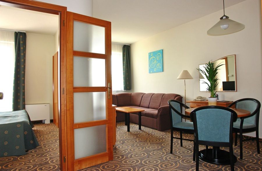 Апартаменты (полуторный номер, общей площадью около 38 м2): гостиная комната с раскладным диваном, спальная комната, ванная комната с ванной или душем, туалет.