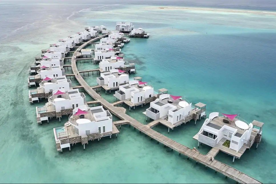 - 6 Water Villa (351 м2/ внутренние помещения - 110 м², макс. 3 или 2+2 реб. до 12 лет). Надводные виллы с одной спальней, гостиной, ванной комнатой, террасой на крыше и частным бассейном.