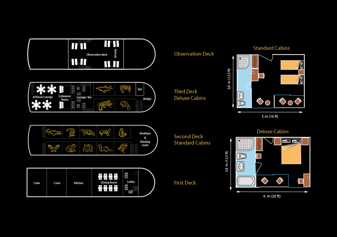 На борту наши гости будут иметь доступ ко всем удобствам. Комфортабельные каюты, бар, спа, столовая, бутик и терраса с видом, который окутает ваши чувства, вы почувствуете себя обнятыми природой, и вы по достоинству оцените величие реки Напо, а также впечатляющую фауну Амазонии: обезьяны, птицы, бабочки, розовые дельфины, наконец бесчисленные животные, населяющие наши эквадорские джунгли.