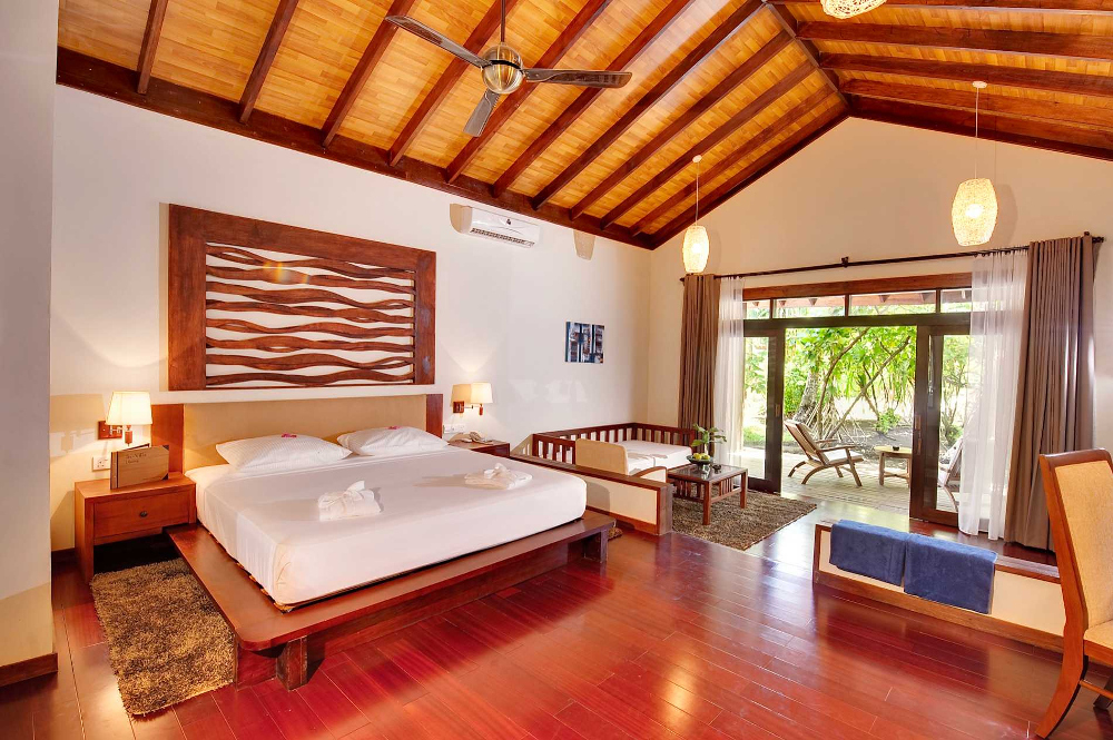 Lagoon Villa (115 м²). Отдельно стоящие водные виллы с террасой и прямым спуском в воду, прозрачная панель в полу гостиной с великолепным обзором подводной жизни рифа, кровать king size с балдахином, джакузи в ванной комнате, кондиционер, электронный сейф, доступ в Интернет, мини-бар, LCD телевизор, потолочный вентилятор, телефон, набор для приготовления чаякофе, кабельное телевидение