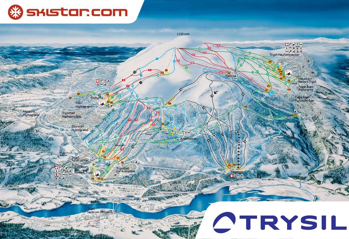 Трюсиль – самый крупный горнолыжный курорт Норвегии. Курорт - одна обширная горнолыжная зона, где подъемники и спуски связывают три стороны горы воедино. По горе пролегает три маршрута, быстрее всего перемещаться по которым можно с помощью горнолыжных подъемников Hesten и Kanken. Эти подъемники быстро доставят вас на высоту 1 100 метров над уровнем моря. С вершины горы открывается фантастический вид на многие километры вокруг.