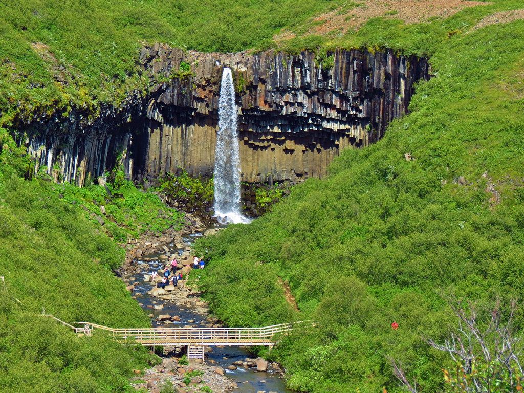 Водопад Свартифосс (Svartifoss), или "черный", несмотря на свое название, представляет собой бурлящие потоки белой воды, которые срываются с края скалы и падают поверх целого ряда блестящих черных базальтовых столбов. Эти камни образовались от медленного остывания вулканических пород, после чего утес был разрушен водой и льдом.