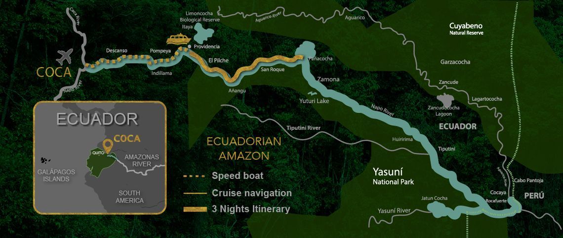 После 30-минутного перелета из Кито в амазонский город Кока (Франсиско де Орельяна) - один из главных входов в эквадорскую Амазонку, вы совершите трансфер до пристани на реке Напо и сядете на моторизованное каноэ, чтобы совершить 90-минутное путешествие по реке по Амазонке, пока не доплывёте до места швартовки круизного судна Anakonda и не получите добро на посадку на борт.