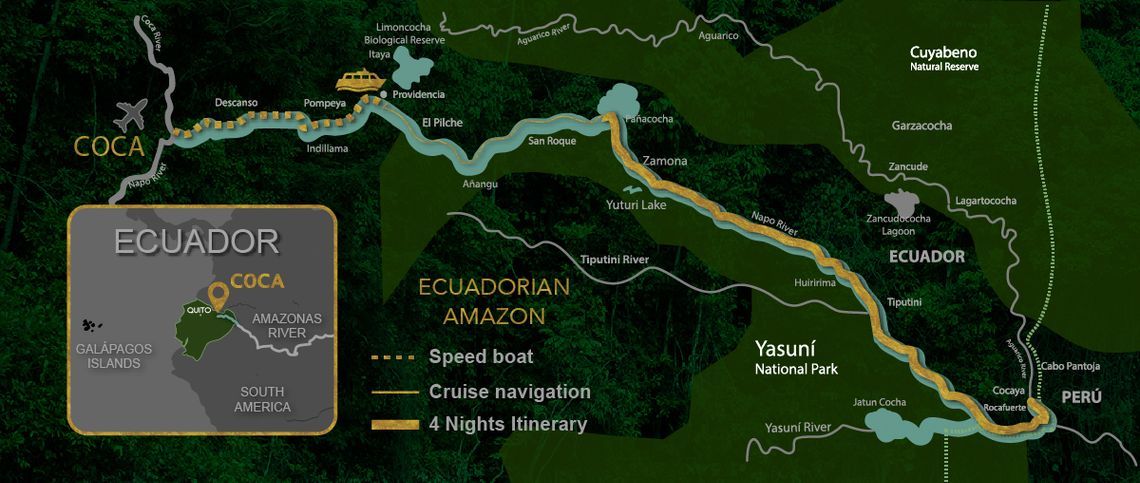 После 30-минутного перелета из Кито в амазонский город Кока (Франсиско де Орельяна) - один из главных входов в эквадорскую Амазонку, вы совершите трансфер до пристани на реке Напо и сядете на моторизованное каноэ, чтобы совершить 90-минутное путешествие по реке по Амазонке, пока не доплывёте до места швартовки круизного судна Anakonda и не получите добро на посадку на борт.