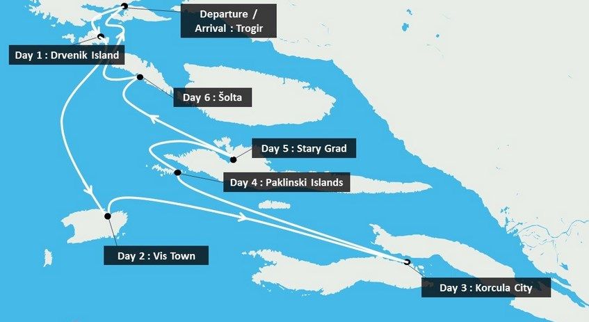 Катамаран пойдет в направлении Трогира. По пути вы можете остановиться и поплавать в ручье. Вы прибудете в Трогир в конце дня. Обязательно пропугяйтесь по этому средневековому городу.
