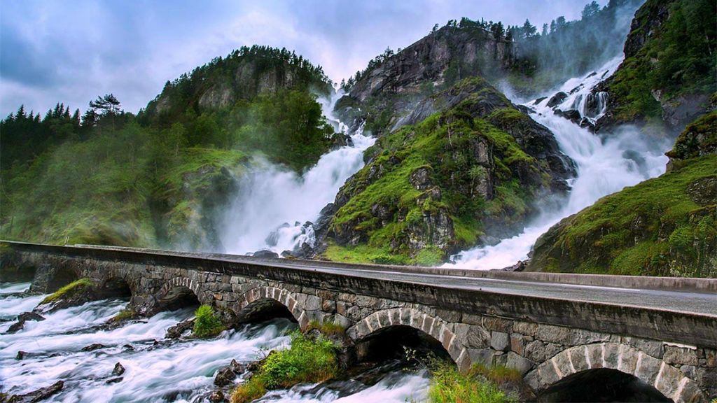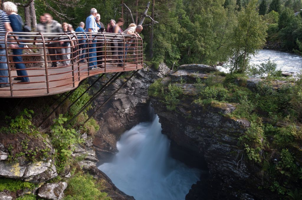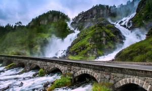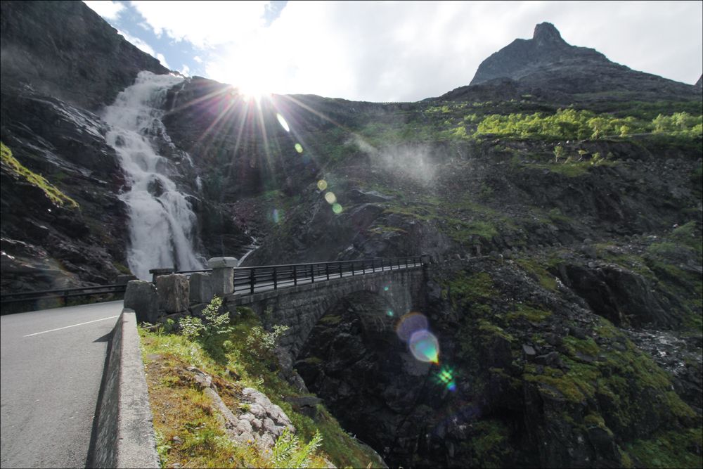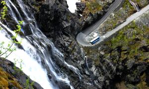 Захватывающее путешествие по известной "Дороге Троллей" (Тролльстиген) является одним из самых популярных туристических маршрутов Норвегии. Эта дорога была построена в 1936 г., она поднимается по горному склону одиннадцатью крутыми петлями серпантина с перепадом высот 12%. На половине подъема Вы проедете по мосту через водопад Стигфоссен (высотой 180 м), а на верхней точке дороги - смотровой площадке, вы сможете увидеть панораму всей долины с водопадами Стигфоссен и Тверрдалсфоссен.
