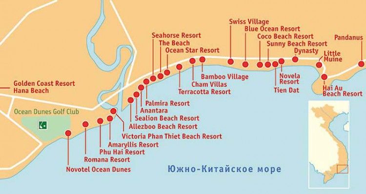 Пляжные отели Фантхиета рассыпаны вдоль побережья — от самого курорта до небольшого полуострова Муйне. Пляж Муйне включает целую россыпь дорогих отельных комплексов, уютных бюджетных пансионов, кафешек и магазинов, которые как жемчужинки расселись вдоль тенистой от пальм улицы Nguyen Dinh Chieu. При этом центром курорта — Ham Tien — считаются адреса со 2 по 98 Nguyen Dinh Chieu,