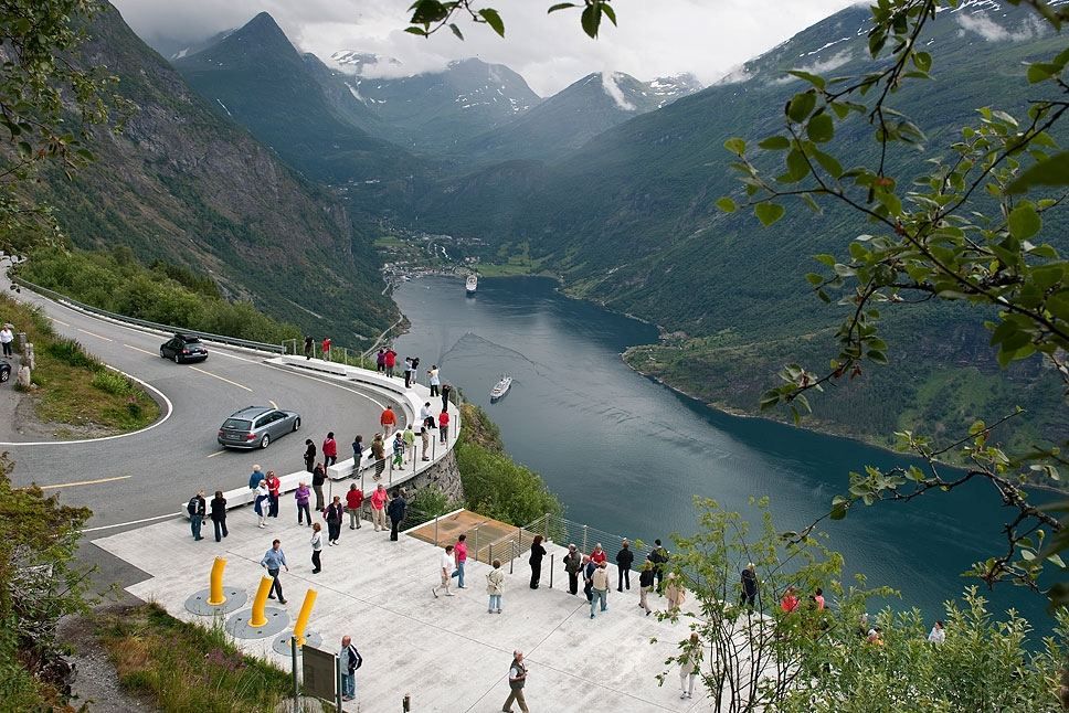 Самый восхитительный вид на фьорд открывается с словно парящей в воздухе скалы Флюдалсьювет — практически, «у порога в небеса». Другие знаменитые местные достопримечательности — водопады, с отвесных скал низвергающие бурлящие каскады воды. Самые известные из здешних водопадов – «Семь сестер» (De syv søstrene), «Жених» (Friaren) и «Фата невесты» (Brudesløret). Они окутывают скалы легкой дымкой, в жемчужных каплях которой переливаются разноцветные радуги.