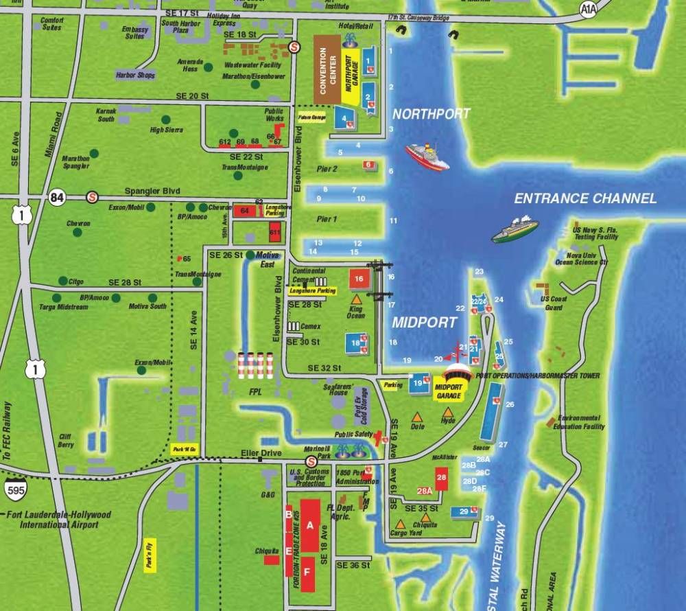 От автобусной остановки аэропорта до порта Port Everglades вы доберётесь на автобусе №1, который ходит каждые 30 минут. Автобус идёт по направлению Broward Central Terminal. Время поездки составляет 12 минут. Нужно выйти на остановке US1/SE 23 S - (SR 84), откуда вы пешком за 10 минут дойдёте до морского порта Port Everglades.