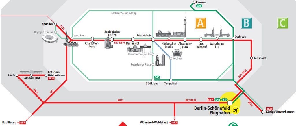 Из аэропорта Шенефельд через центр Берлина (Центральный железнодорожный вокзала Hauptbahnhof) идут RB14, RB19 и RE7, а RB22 идет прямо в Потсдам не заезжая в Берлин. Стоимость проезда в центр Берлина 3,3€, это 2-х часовой билет на три зоны АВС, а до города Потсдам всего 3€ (зоны ВС). Время в дороге до центрального вокзала Берлина (Berlin Hbf) 30-35 минут, а до Потсдама 55-60 минут.