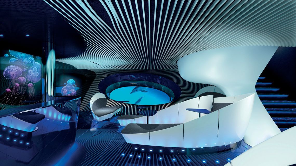 Мультисенсорная подводная зона Blue Eye - уникальное пространство, находясь в котором гости могут "слиться" с неверотным подводным миром: освещение зала позволяет наблюдать за зрелищем, разворачивающемся снаружи, через интегрированные цифровые экраны, на которые проецируются изображения, снятые тремя подводными камерами. Звуковой дизайн зала позволяет гостям опыт уникального акустического погружения. Расположившись на уютных диванах, гости имеют возможность получить уникальный иммерсивный звуковой опыт - уникальное сенсорное слушание через телесные вибрации. Это приближает посетителей к морским млекопетающим, которых они могут видеть и слышать позади гигантских иллюминаторов.