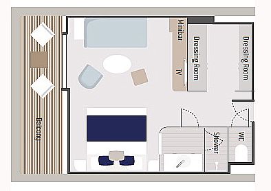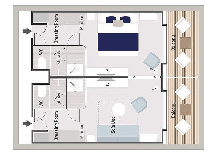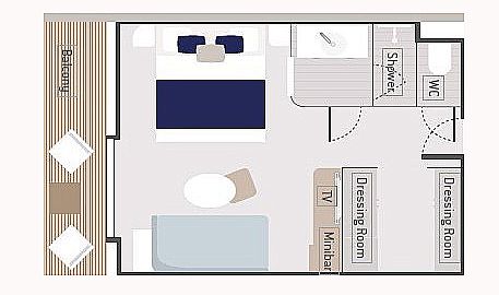Вместимость до 3 пассажиров в каюте. Балкон 6 кв. м. Индивидуальный кондиционер. Диван. Мини-бар. Док-станции для IPod ™. Фен. Халаты. Французская косметика в ванной. Электричество 110/220 В. Ванная комната с душем. Спутниковое ТВ. Сейф. Спутниковый телефон с прямой линией. Безлимитный Wi-Fi. Обслуживание номеров 24 часа.