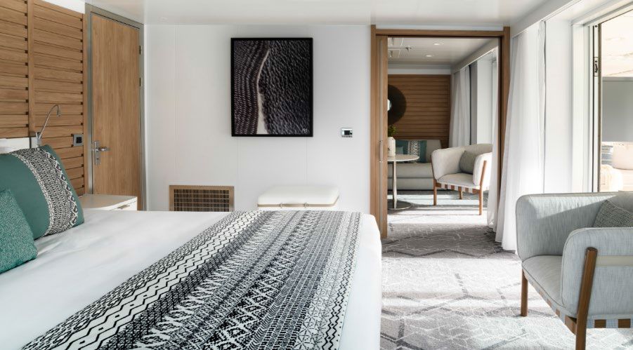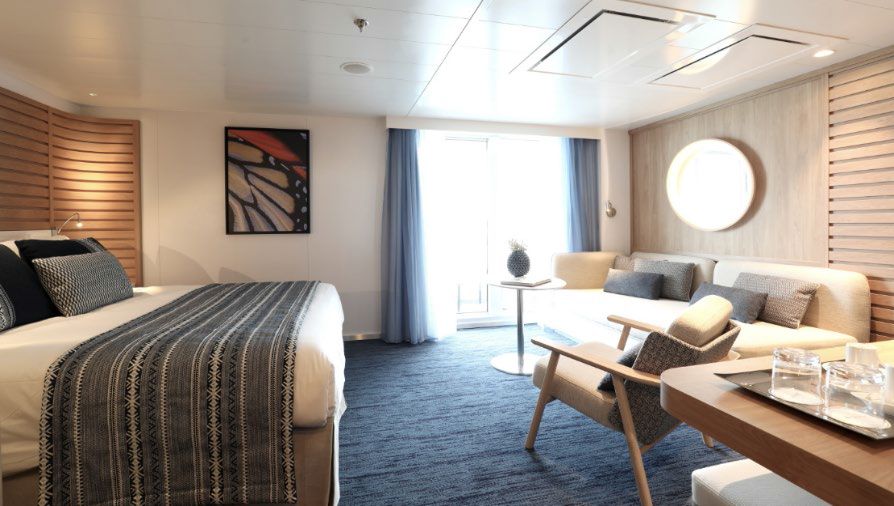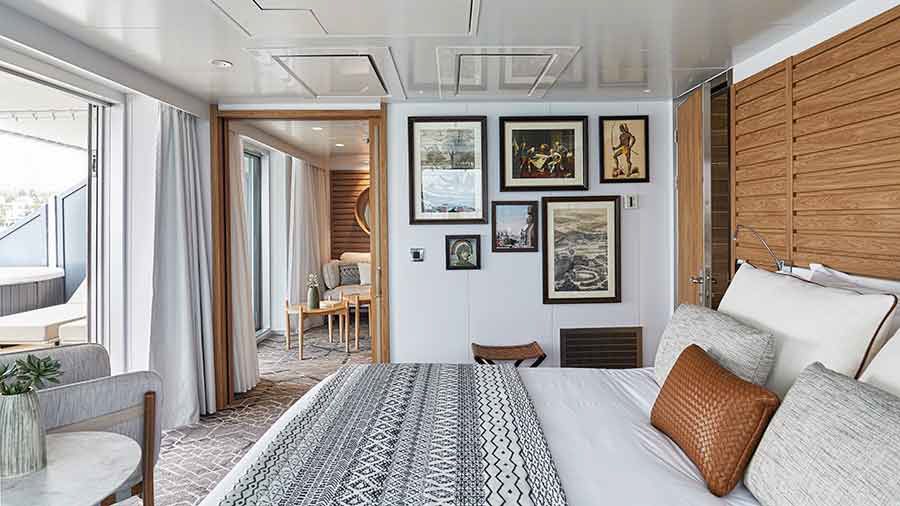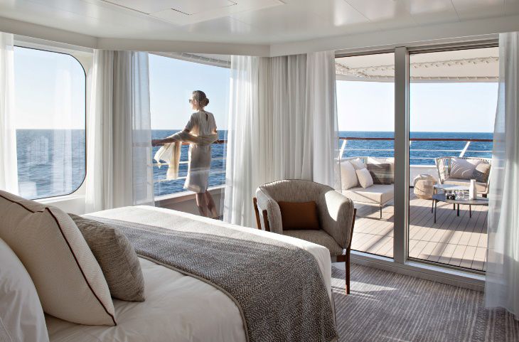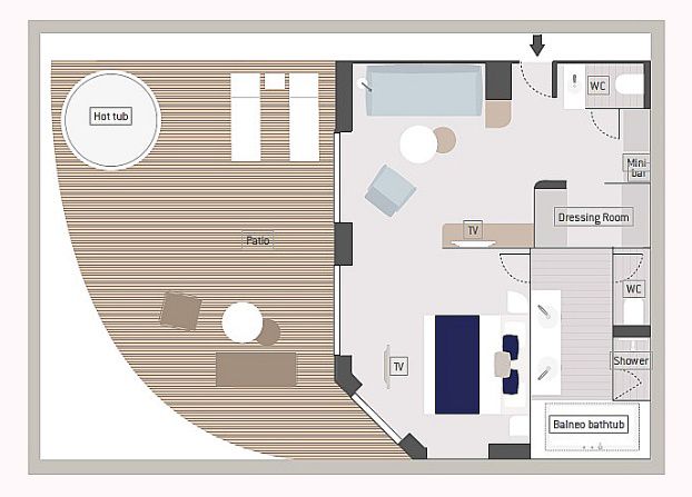 Вместимость до 4 пассажиров в каюте. Балкон 30 кв. м. Джакузи на террасе. Индивидуальный кондиционер. Мини-бар. Док-станции для IPod ™. Фен. Халаты. Французская косметика в ванной. Электричество 110/220 В. Ванная комната с душем и ванной с джакузи. Спутниковое ТВ. Сейф. Спутниковый телефон с прямой линией. Безлимитный Wi-Fi. Обслуживание номеров 24 часа. Услуги батлера. Индивидуальный трансфер: аэропорт — отель — порт и обратно. 1 бесплатный час в салоне СПА.