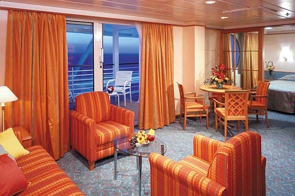 Самые привилегированные каюты с точки зрения площади и расположения, а также особых видов сервиса. Благодаря наличию веранды, увеличенной площади и панорамным окнам в каюте всегда много света. Балкон оснащен парой шезлонгов и столиком. К Вашим услугам спальная зона с двумя односпальными кроватями с возможностью их объединения в одну кровать Royal King, две дополнительные откидные кровати, гостиная с диваном, две ванные комнаты с ванной и душевой кабиной, а также мини-бар, холодильник, сейф, кондиционер, внутренний телефон, телевизор с поддержкой кабельного вещания. Дополнительные привилегии: приоритет при посадке, возможность заказать в каюту завтрак, обед и ужин из ресторана, роскошные спа халаты и тапочки в каюте.