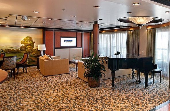 Самые привилегированные каюты с точки зрения площади и расположения, а также особых видов сервиса. Благодаря наличию веранды, увеличенной площади и панорамным окнам в каюте всегда много света. Балкон оснащен парой шезлонгов и столиком. К Вашим услугам спальная зона с двумя односпальными кроватями с возможностью их объединения в одну кровать Royal King, гостиная с диваном, а также ванная комната с ванной и двумя раковинами, мини-бар, холодильник, сейф, кондиционер, внутренний телефон, телевизор с поддержкой кабельного вещания. Дополнительные привилегии: приоритет при посадке, возможность заказать в каюту завтрак, обед и ужин из ресторана, роскошные спа халаты и тапочки в каюте.