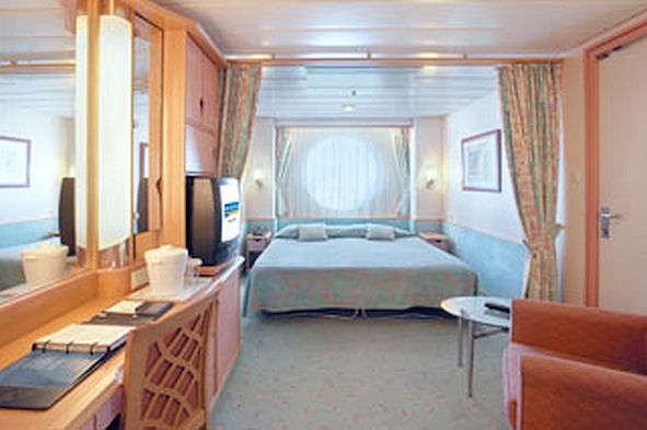 Данные каюты порадуют своих гостей большим окном, открывающим прекрасный вид на небо и океан. К Вашим услугам спальная зона с двумя одноместными кроватями, которые можно объединить в одну кровать Royal King, гостиная с софой, а также ванная комната с душевой кабиной, мини-бар, сейф, кондиционер, внутренний телефон, телевизор с поддержкой кабельного вещания.