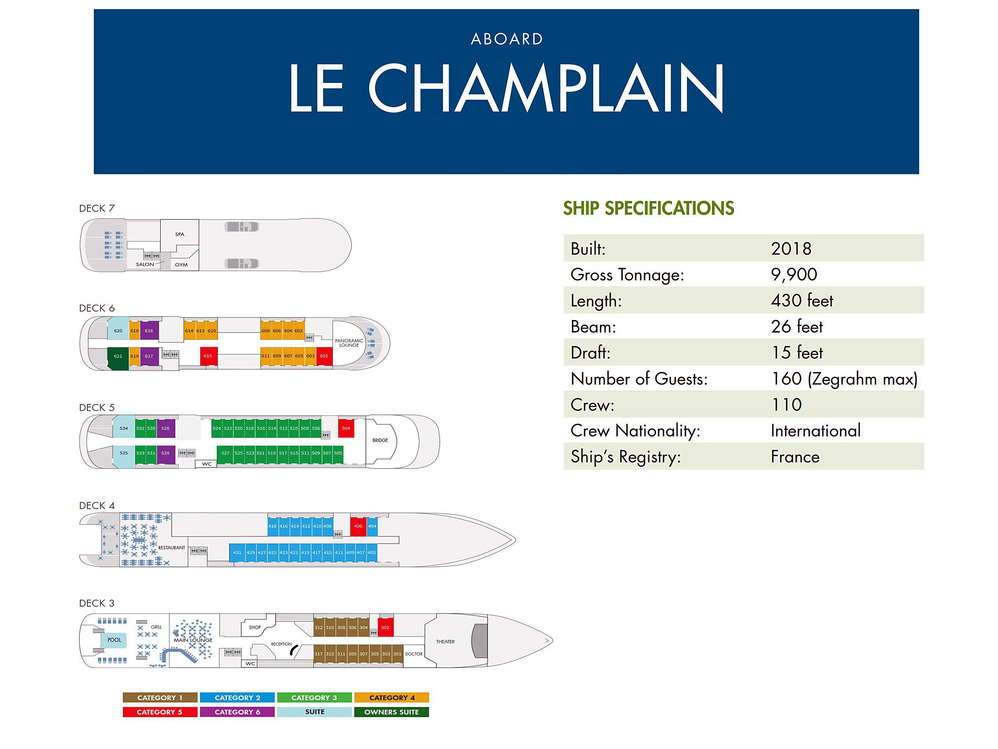 Второе судно в новой линии Ponant Explorer, точная копия мега-яхты Le Laperouse. Судно, позволяющее пассажирам получить новый исследовательский опыт, такой, как тропические экспедиции. Уникальная смесь открытий и исключительного комфорта даже в самых удаленных уголках мира. Инновационное и безвредное для окружающей среды судно, новешая мега-яхта французской компании Ponant - Le Champlain. Спуск на воду - конец 2018г. К услугам пассажиров – 92 превосходно оснащенные и изысканно декорированные каюты – категорий Deluxe, Deluxe suite, Grand Deluxe suite, Prestige, Prestige suite, Privilege suite, Owner's suite. Все они имеют вид на море и оборудованы балконами. Нежные цвета, в которых выполнена обстановка и отделка кают, создают атмосферу умиротворения и элегантной роскоши. Все каюты имеют систему кондиционирования, удобную и мягкую мебель, минибар и сейф, спутниковое телевидение и чудесные туалетные принадлежности от известных мировых производителей в ванной комнате. Все каюты обслуживаются 24 часа в сутки.