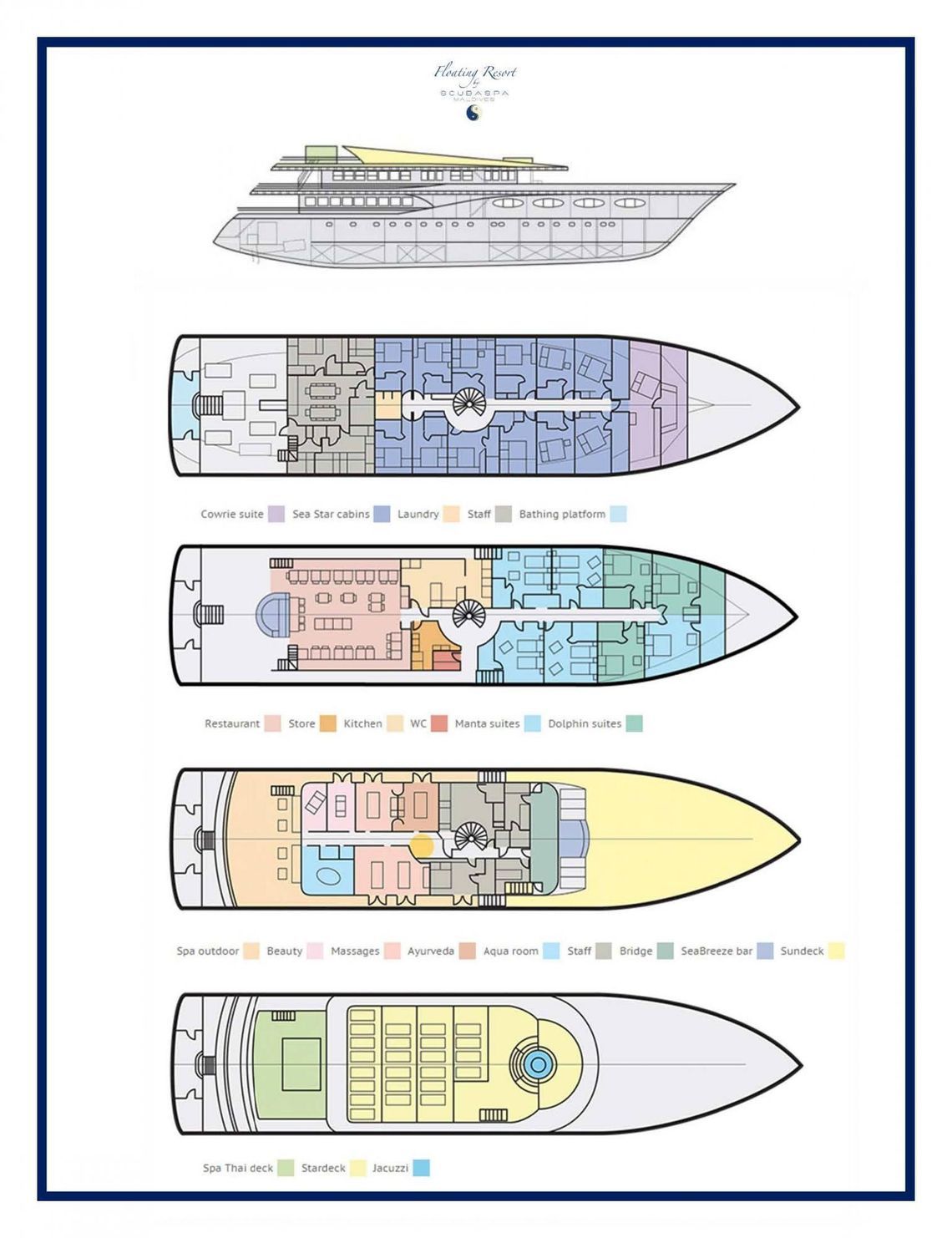 Яхты «Scubaspa Ying» или «Scubaspa Yang», сопровождаются собственными катерами, которые служат плавучими дайв-центрами. Основываясь на десятилетнем опыте погружений на Мальдивах, дайв-суда были специально разработаны для вашего комфорта и расслабления.