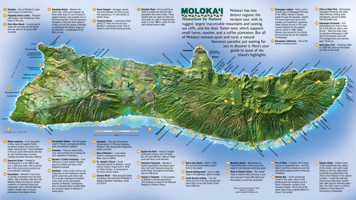 Здесь расположены самые высокие морские утесы в мире (их можно увидеть в третьей части фильма "Парк юрского периода") и самый длинный риф США (длина около 40 км). Столица острова - Каунакакаи до сих пор имеет облик приморского городка XIX столетия, а туристическая инфраструктура минимальна - остров больше славится своими пейзажами, спокойным окружением и живым местным сообществом.