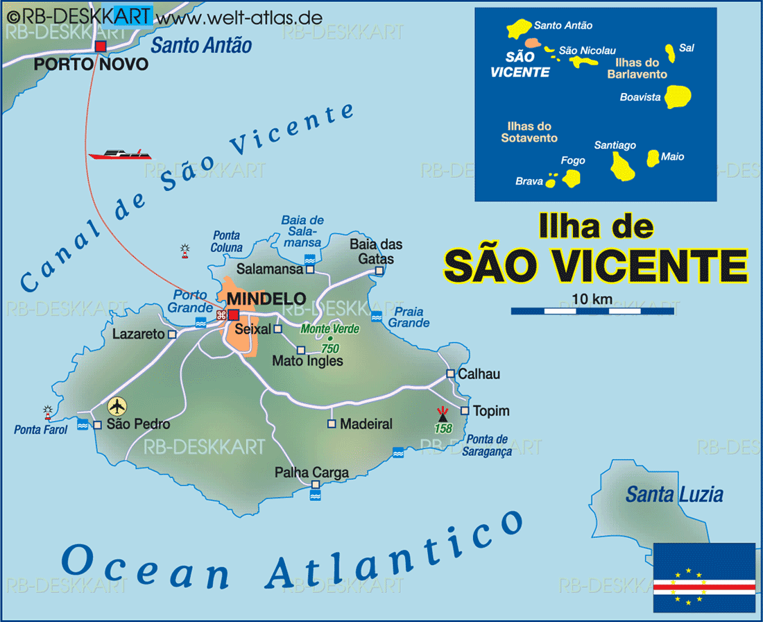 Сан-Висенте (São Vicente) — прелестный остров-курорт вулканического происхождения, который стал всемирно известен, как родина великой певицы Сезарии Эворы. Здесь открыт Национальный Центр Ремесла — место, где было восстановлено традиционное текстильное ремесло, а также изготовление украшений из ракушек и камней.