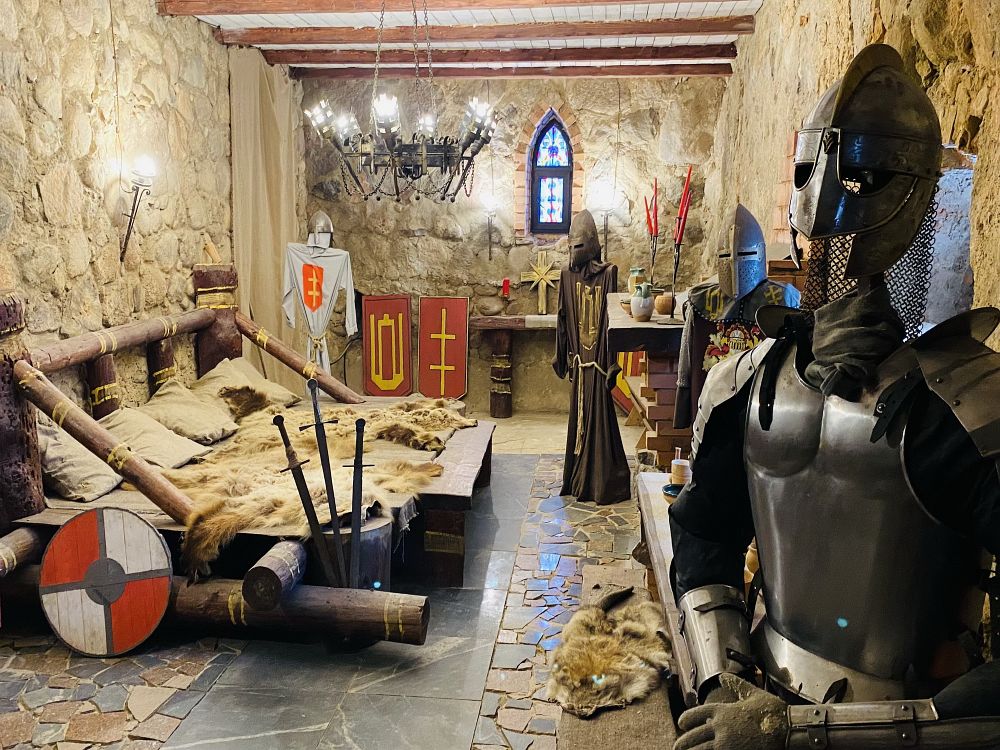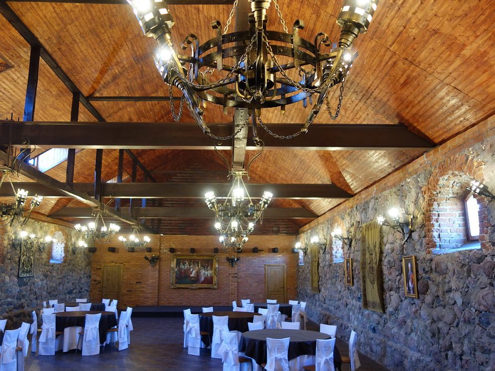 За стеклянными дверями Ассамблеи размещен зал рыцарской славы с его собранием гобеленов и картин, освещенный средневековыми люстрами и факелами ручной работы, поистине королевских размеров камин, придающий особый уют и шарм великолепному церемониальному залу, вмещающему до двухсот гостей.