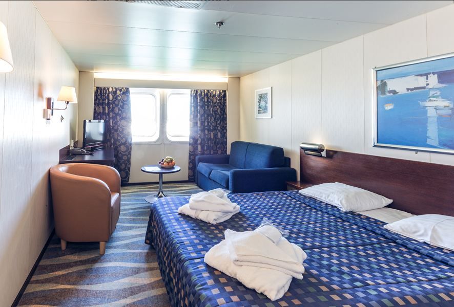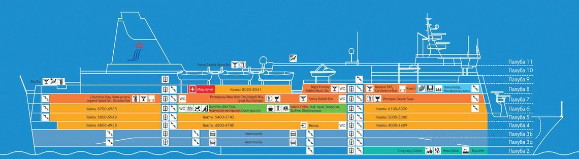 На 4 палубе расположены 4−х местные каюты класса F без окна, которые идеально подойдут для экономных путешественников. Эти каюты расположены в центральной части судна вблизи мест активных развлечений. 2−х и 4−х местные каюты без окна класса B, расположенные на 4, 5 и 6 палубах парома, также являются экономичным вариантом для размещения. Они отлично подходят для тех, кто любит проводить время, общаясь с друзьями в баре до поздней ночи или провожать закат, прогуливаясь по открытой палубе. Ведь так приятно после насыщенного дня просто отдохнуть на мягкой кровати. Для тех, кто путешествует один или с активными детьми, подойдут каюты класса B2V, спальные места в которых расположены друг над другом. Для тех, кто рад полюбоваться звездным небом из окна уютной каюты или проснуться от ласковых солнечных лучей, которые пробиваются сквозь шторы, мы рекомендуем размещение в 2−х или 4−х местных каютах класса А. Эти каюты расположены на 4, 5 и 6 палубе парома. Одними из наиболее удобных кают повышенного класса комфортности являются 2−х местные каюты класса Commodore, расположенные на 5 и 6 палубах парома.Помимо уютной двуспальной кровати, в каюте есть зона отдыха с мягкими креслами, журнальным столиком и телевизором. В ванной комнате предусмотрен фен. В стоимость каюты входит мини-бар, завтрак Deluxe для каждого пассажира и посещение сауны в утренние часы. Незабываемый вид на Балтийское море открывается из широких окон 2−х или 3−х местных кают класса Deluxe, которые расположены на 5 и 8 палубах. Выбирая эту каюту, вы можете быть уверены, что ощутите себя как дома. Здесь есть всё для самого комфортного путешествия: двуспальная кровать, телевизор, мини-бар, фен, мягкие и удобные кресла. В стоимость каюты входит завтрак Deluxe и посещение сауны в утренние часы. Для тех, кто ценит отдых самого высокого класса и не распыляется по мелочам, мы предлагаем шикарные 2−х комнатные апартаменты с видом на море класса Suite, расположенные на 6 палубе парома. Для незабываемого отдыха в этой каюте есть абсолютно все: просторная гостиная и уютная спальня с отдельной ванной комнатой. В стоимость каюты входит регистрация и прохождение паспортного контроля без очереди, мини-бар, завтраки Deluxe с шампанским и икрой в ресторане New York City, посещение сауны в утренние часы и wi-fi. Уважаемые пассажиры, в настоящее время нет возможности выбора расположения каюты на пароме. Все каюты распределяются системой автоматически в день отправления. При необходимости вы всегда можете обратиться для решения вашего индивидуального вопроса к сотрудникам компании на борту парома. Информационный пункт расположен на 6 палубе. |