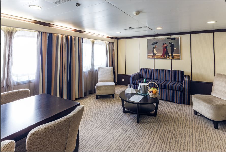 Шикарные двухкомнатные апартаменты с видом на море. В гостиной: удобные диваны, уютные кресла, стол для переговоров, кофе-машина Nespresso, минибар, LED TV, ванная комната. В спальне: кровать King Size, шкаф-купе, отдельная ванная комната (халаты, тапочки, полотенца, набор средств для ванны, фен). В стоимость каюты входит: доступ к Интернет, завтрак с искрящимся шампанским и икрой, мини бар, посещение сауны в утренние часы. Для ребенка в возрасте от 7 лет требуется отдельное место в каюте, как для взрослого. |
