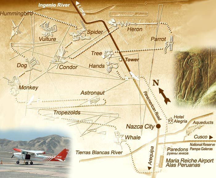 В зависимости от аэропорта вылета вы сможете обозреть часть из них. Перед полетом выдается схема геоглифов, над которыми будет осуществляться полет. Во время полета пилот объявляет наименование геоглифа, следующего для обозрения.