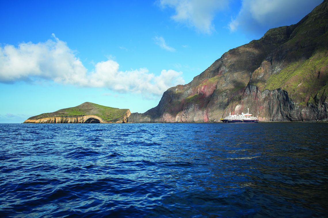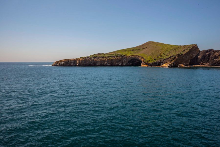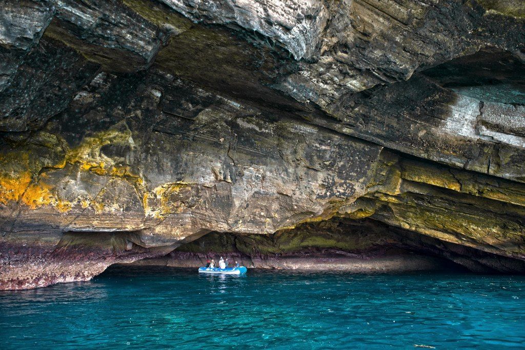 Популярное место для стоянки судна, чтобы потом взять небольшой катер и проптлыть на нем вдоль скал, которые содержат остатки вулкана и исследовать частично затонувшие пещеры у самой кромки воды. Синеликие и синелапые олуши будут смотреть на вас с отвесных скаловых образований, а нелетающие бакланы будут плескаться у береговой линии.