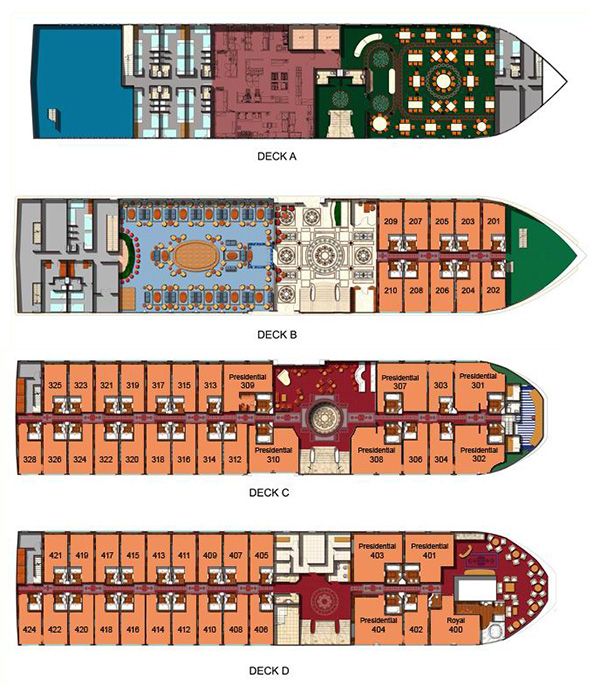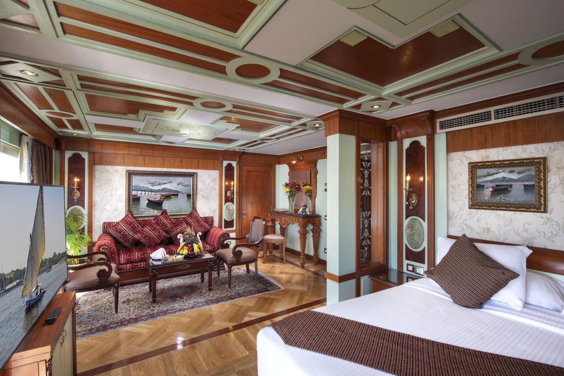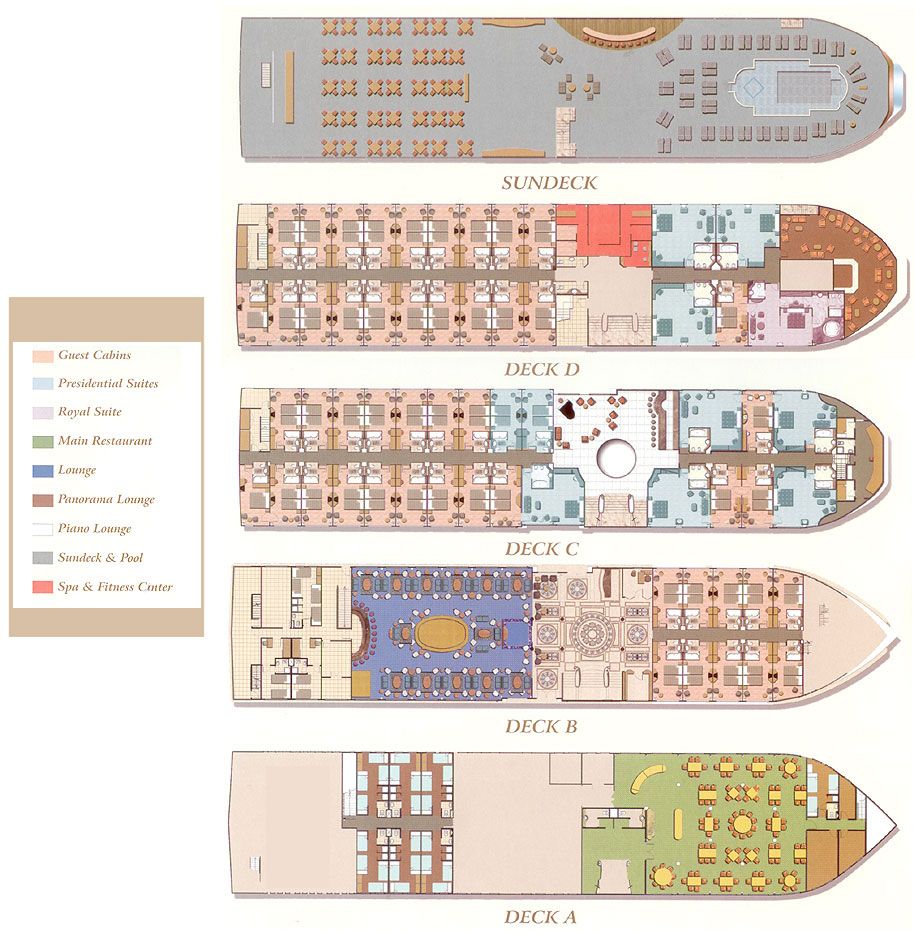 Судно предлагает гостям 57 кают: 47 кают делюкс, 9 президентских люксов и 1 королевский люкс. Все каюты обеспечивают максимальный комфорт, доступ в Интернет, ванные комнаты оборудованы спа-блоком, включая паровую баню, джакузи и водный массаж.
