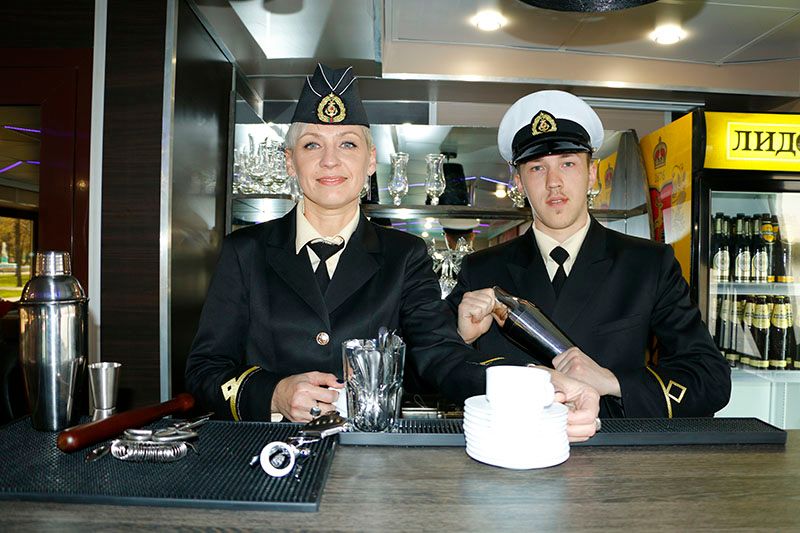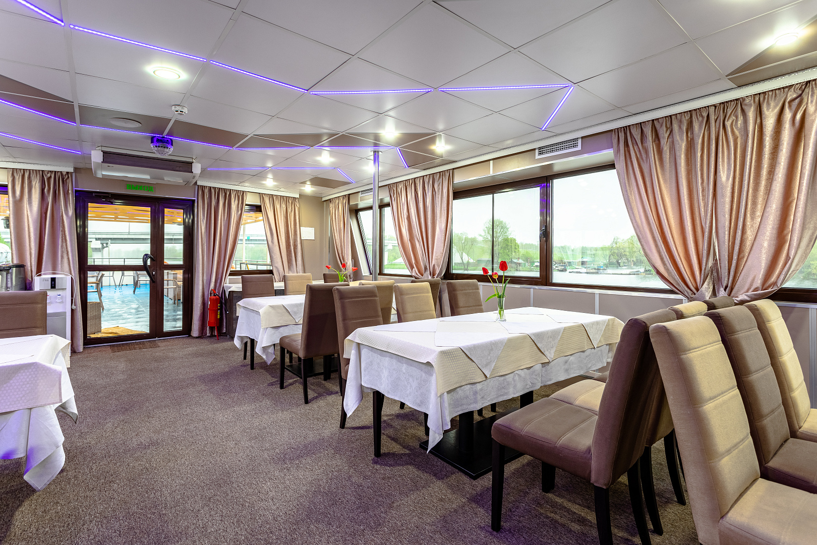 На борту по-настоящему теплая домашняя атмосфера, благодаря небольшому размеру теплохода и белорусскому гостеприимству. В «Комфортах» есть дополнительное спальное место, и кондиционер. «Люксы» представляют собой двухкомнатные трехместные каюты высшего класса со всеми удобствами. В них возможна установка дополнительного спального места (по запросу).