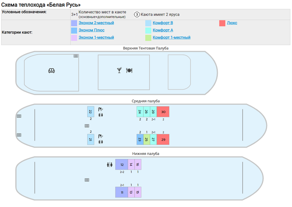 На теплоходе 3 палубы и 16 кают различных категорий:
