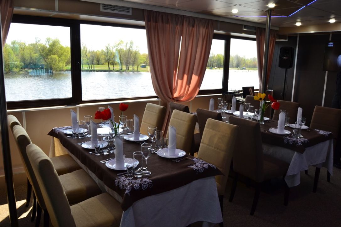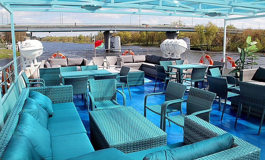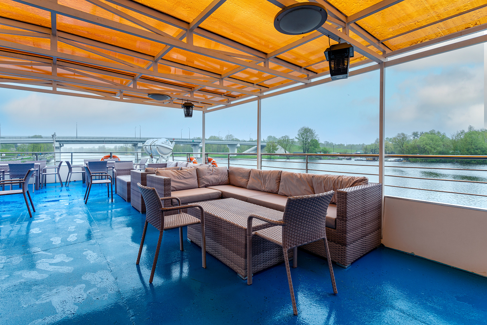 - полуоткрытая площадка для отдыха. Аккуратные небольшие диваны со столиками помогут удобно разместиться и наслаждаться непередаваемой красотой Полесья. Над палубой установлен навес, благодаря которому здесь комфортно находиться как в солнечную погоду, так и во время дождя.