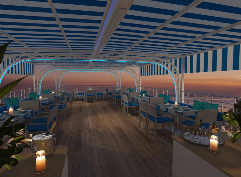 - панорамный-ресторан, где сервируются завтрак, обед, и ужин. Днём здесь также накрывается чаепитие со сладостями, тентовая палуба.
