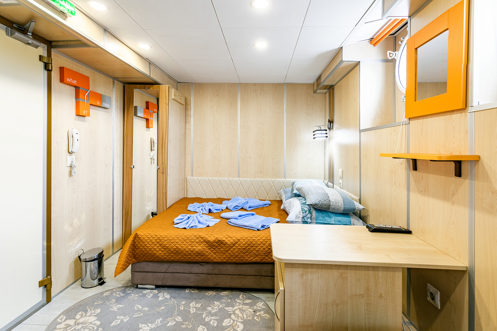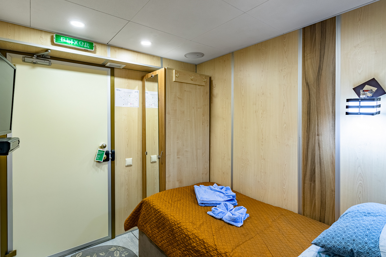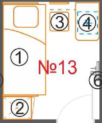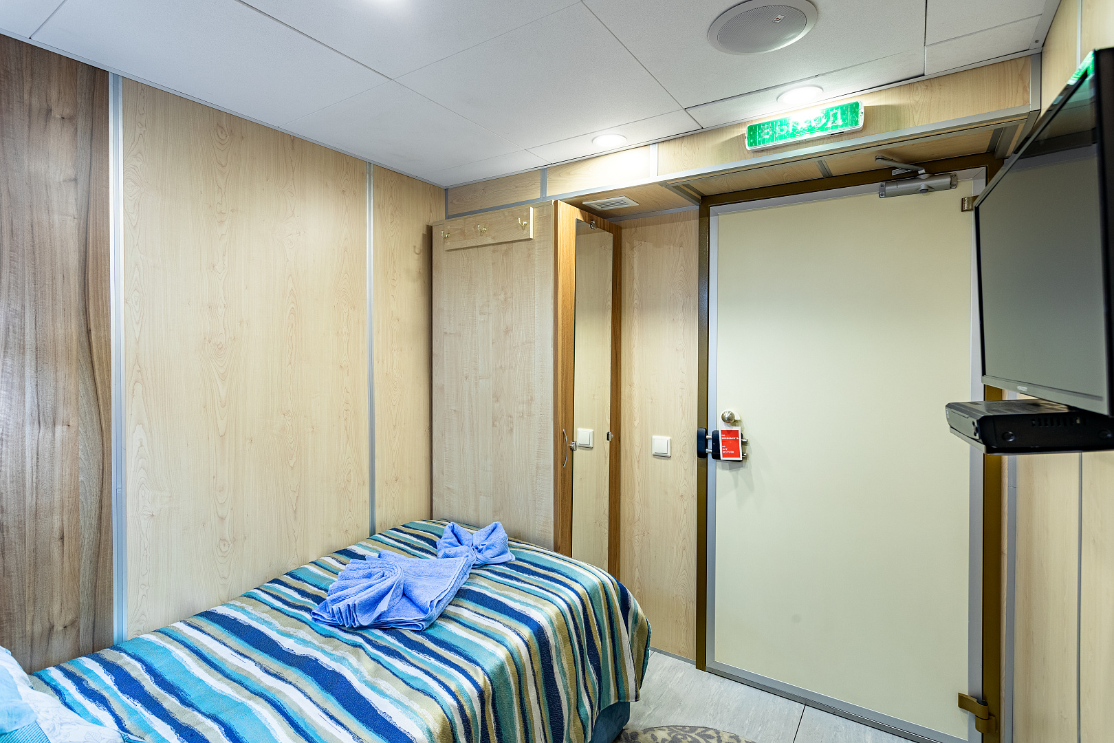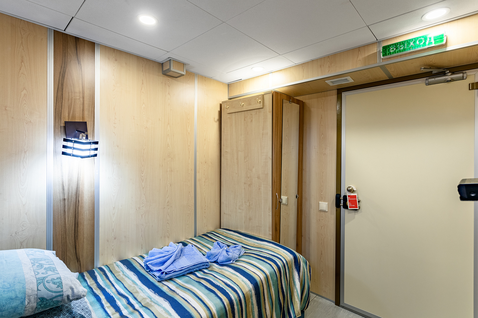Пассажиры этой каюты пользуются общими удобствами (душ, туалет), расположенными на Нижней и Средней палубе.