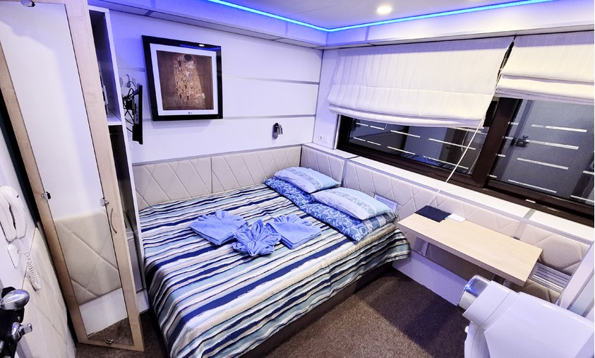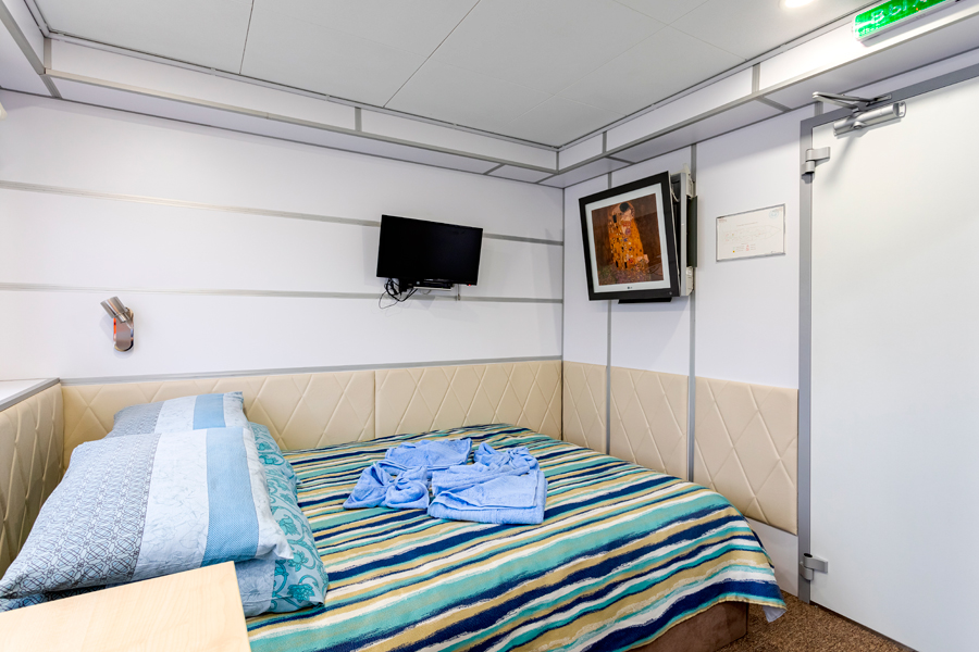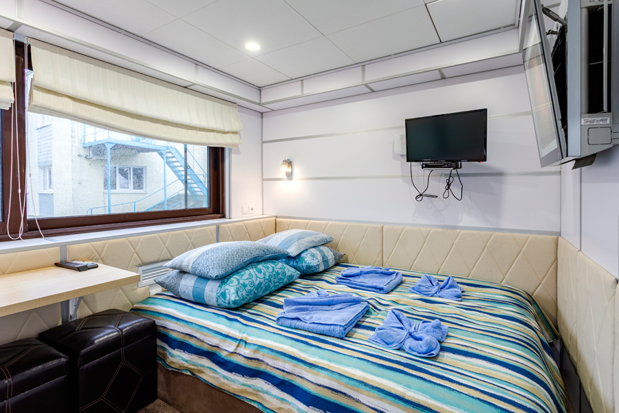 В каюте: двуспальная кровать, ванная комната (раковина, душ, туалет), столик, пуф, шкаф, телевизор, фен, телефон внутренней связи, радио, холодильник, сейф, панорамное открывающееся окно.