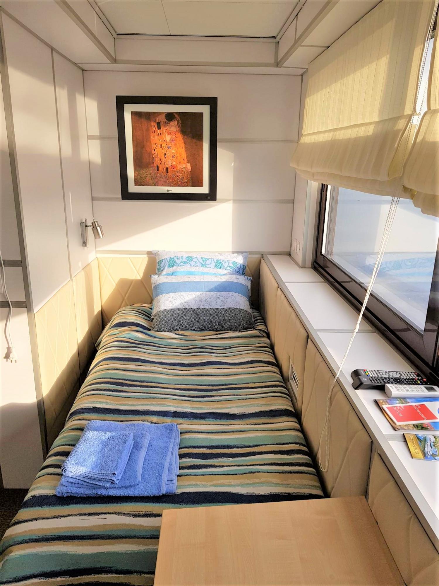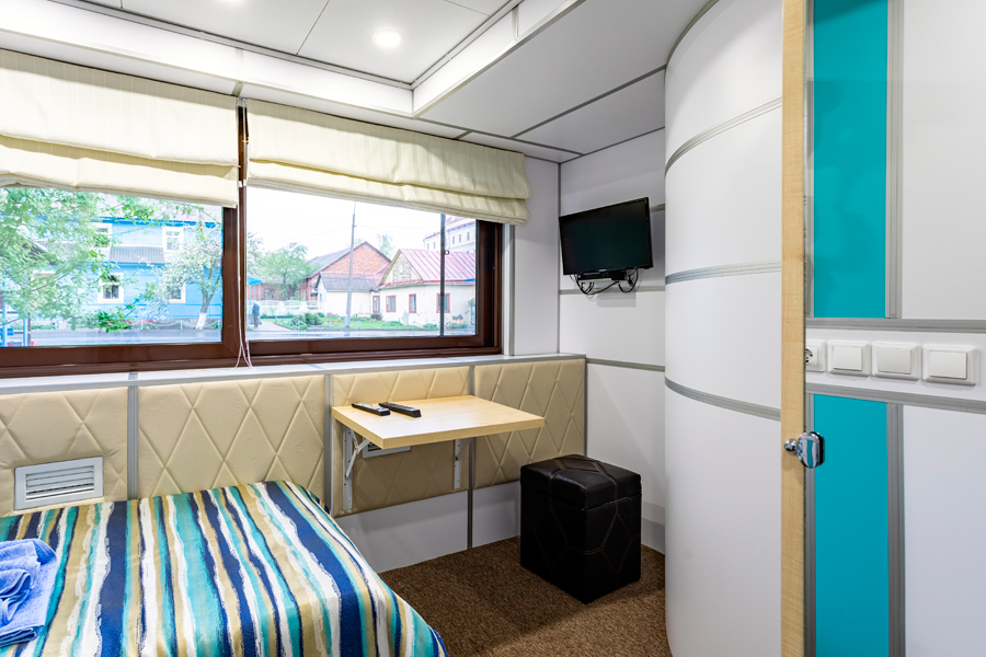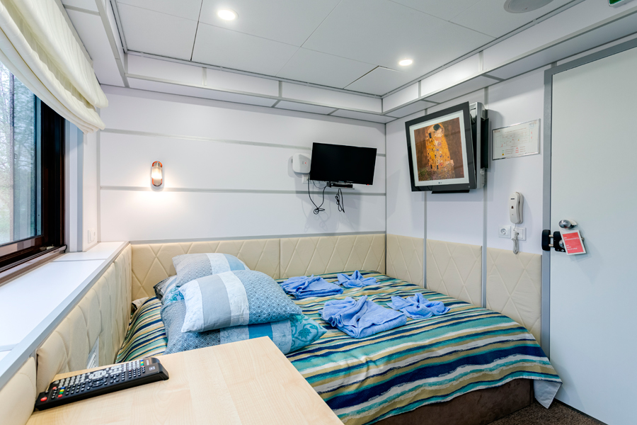 В каюте: односпальная кровать, ванная комната (раковина, душ, туалет), столик, пуф, телевизор, холодильник, кондиционер, телефон, радио, сейф, фен, панорамное открывающееся окно.
