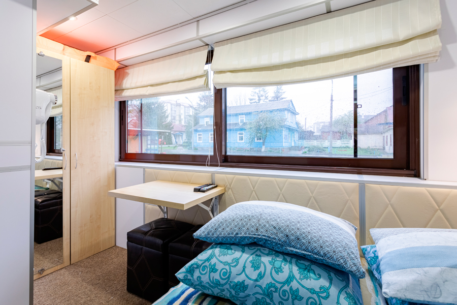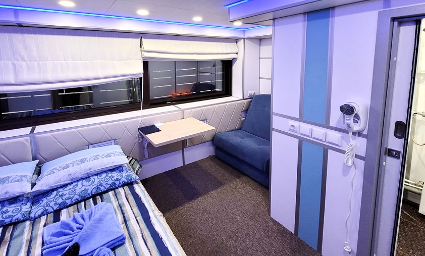 Очень просторная, но в то же время уютная каюта с большим затемненным панорамным окном. Одним из сюрпризов каюты класса «Комфорт» является кондиционер-картина. Эстетически приятный, он также практически бесшумен. Благодаря этому его можно смело оставить включённым на ночь для поддержания комфортной температуры во время сна. Работает как на охлаждение, так и на обогрев, что важно в завершающих рейсах навигации.
