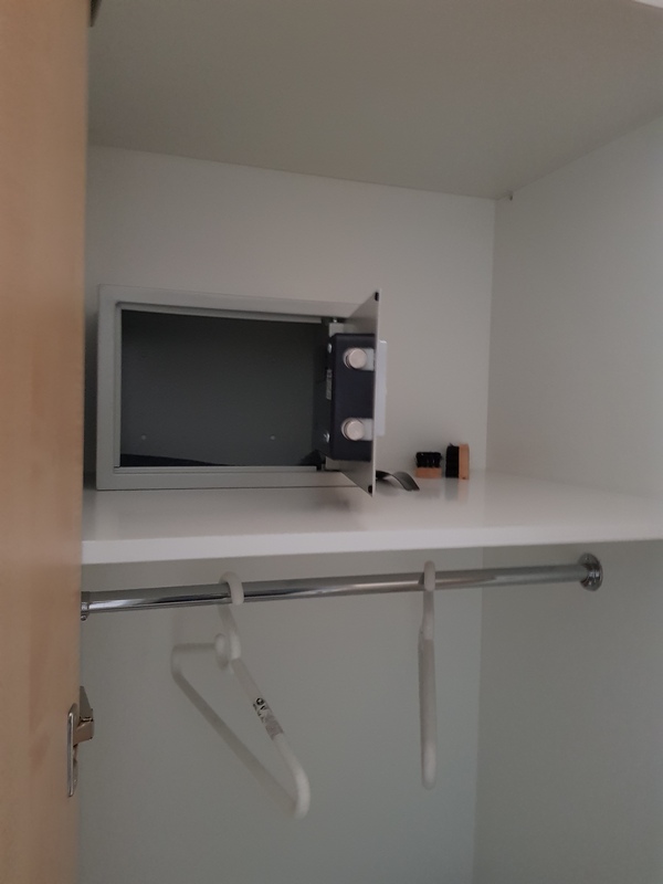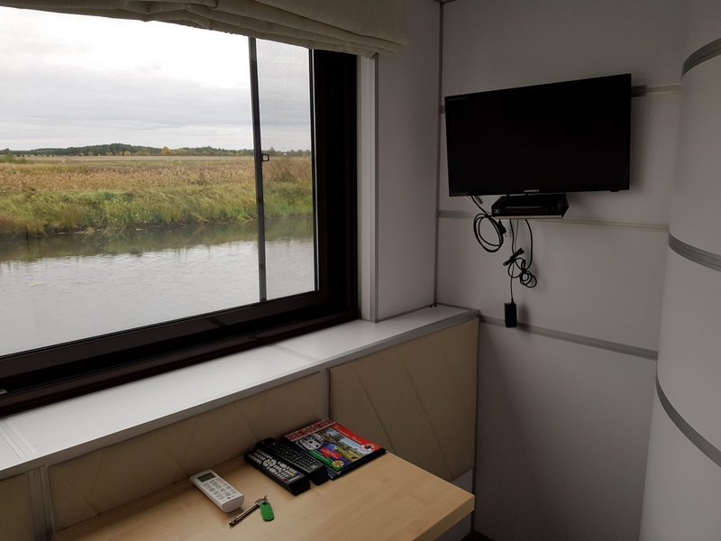 В каюте: двуспальная кровать, ванная комната (раковина, душ, туалет), столик, пуф, телевизор, холодильник, кондиционер, телефон, радио, сейф, фен, панорамное открывающееся окно.