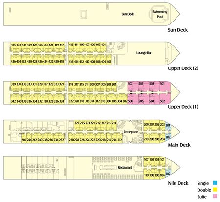Благодаря слаженной работе команды экипажа Вас ждет высочайший уровень обслуживания. На борту судна Вы сможете полностью отдохнуть и погрузиться в удивительную и экзотическую египетскую атмосферу. Побалуйте свое тело массажем, приобретите шоколадный загар, наслаждаясь солнечными лучами на огромной солнечной палубе, отведайте настоящие шедевры кулинарного искусства от египетских шеф - поваров. Во время остановок у Вас будет прекрасная возможность увидеть чудеса Древнего Египта: сохранившиеся храмы, пирамиды и ботанические сады. Отдохнуть после экскурсий на суше можно в просторном баре или в уютной каюте за чтением любимой книги или просмотром фильма. Что бы Вы ни выбрали, Вам захочется, чтобы путешествие по Нилу никогда не заканчивалось, а отдых продолжался бесконечно. Современные номера корабля располагают мебелью из темного дерева, кроватями с бархатным постельным бельем, телевизором со спутниковыми каналами и мини-баром, а также гостиной с балконом.