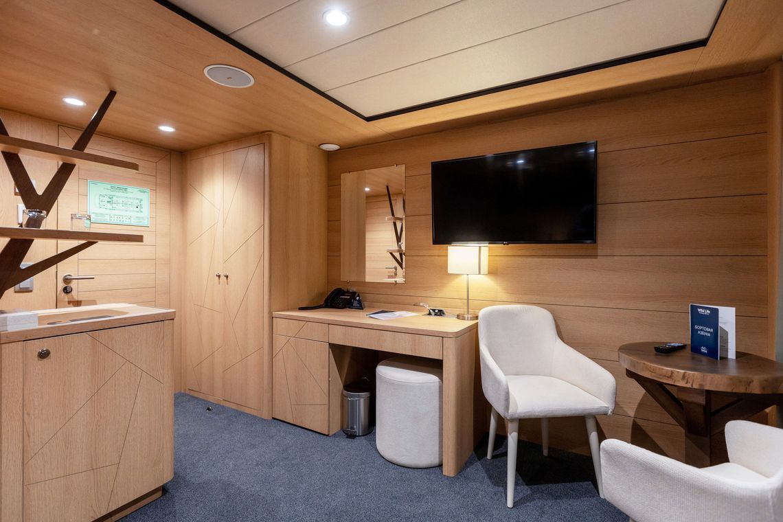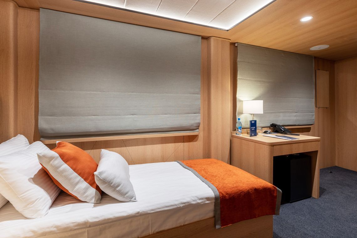 - 44 Каюты категории ДЕЛЮКС на 2 или 3 человек, расположенные на Верхней, Средней и Главной палубах, оборудованы всеми удобствами, включая двуспальную кровать и диван-кровать, который может использоваться как дополнительное место, шкаф для одежды, 2 больших окна.