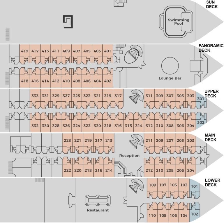Верхняя палуба (2) круизного лайнера MS Crown Prince Nile состоит из 18 двухместных кают.