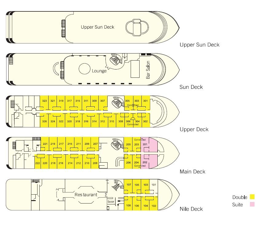 На Средней палубе расположено 2 каюты SUITE площадью 35 кв.м. и 19 кают DOUBLE площадью 22 кв.м.