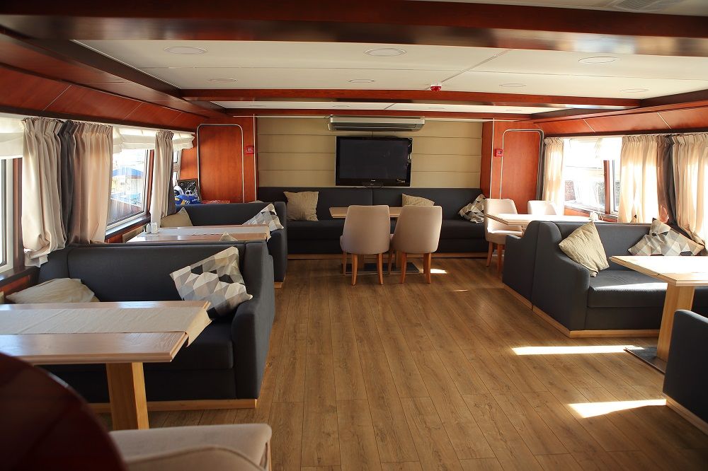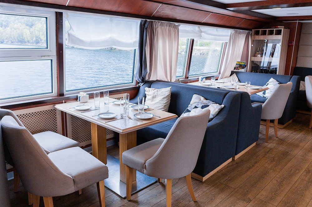 На борту теплохода на верхней палубе работает бар и ресторан с панорамными окнами, а также имеется зона отдыха на открытой палубе, с которой можно любоваться красотами Байкала в течение всего круиза.