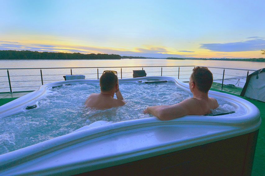 Гости также могут попробовать свои силы в традиционных ремеслах или насладиться нашими услугами на борту, включая спа-салон Rainforest, захватывающий вид из нашей горячей ванны Amazon, коктейли в нашем баре и лаундже.