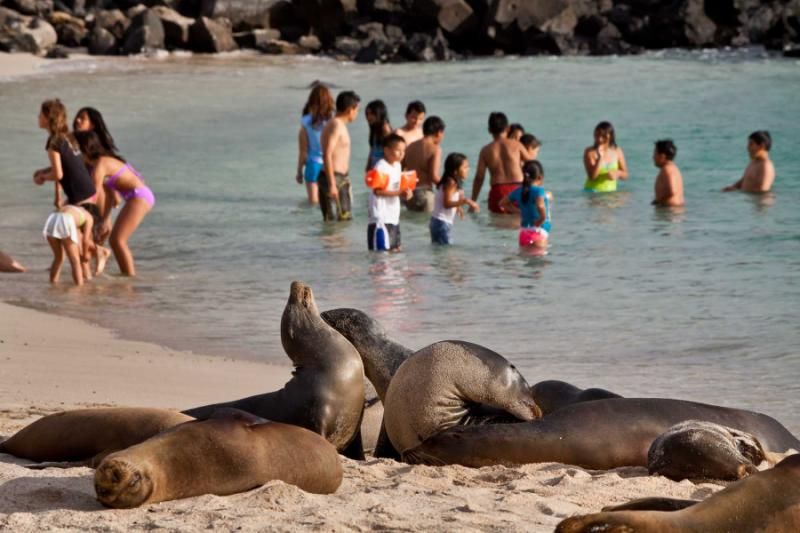 Далее – смена одежды для посещения пляжа. Во время прогулки на лодке наши гости увидят галапагосских пингвинов (ростом всего 50 сантиметров), стоящих у подножия утеса или плавающих со скоростью пули в прозрачных водах океана. По прибытии на берег туристов ждет короткий поход через дюны к северному пляжу. Это – гнездовье пеликанов. Здесь можно будет увидеть маленьких рифовых акул. Возвращение на южный пляж, где неглубокое море дает вам возможность для купания и снорклинга рядом с галапагосскими пингвинами, акулами, морскими звездами, скатами, морскими черепахами и множеством экзотических разноцветных рыб, а также вы сможете увидеть несколько видов постоянных жителей островов: морские игуаны, морские львы, пеликаны и многое другое.
